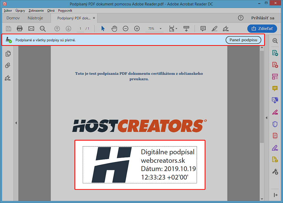 PDF dokument podpísaný týmto certifikátom zobrazuje informačný pás s názvom spoločnosti a vydavateľom certfikátu, ako vidno na nasledujúcom obrázku: