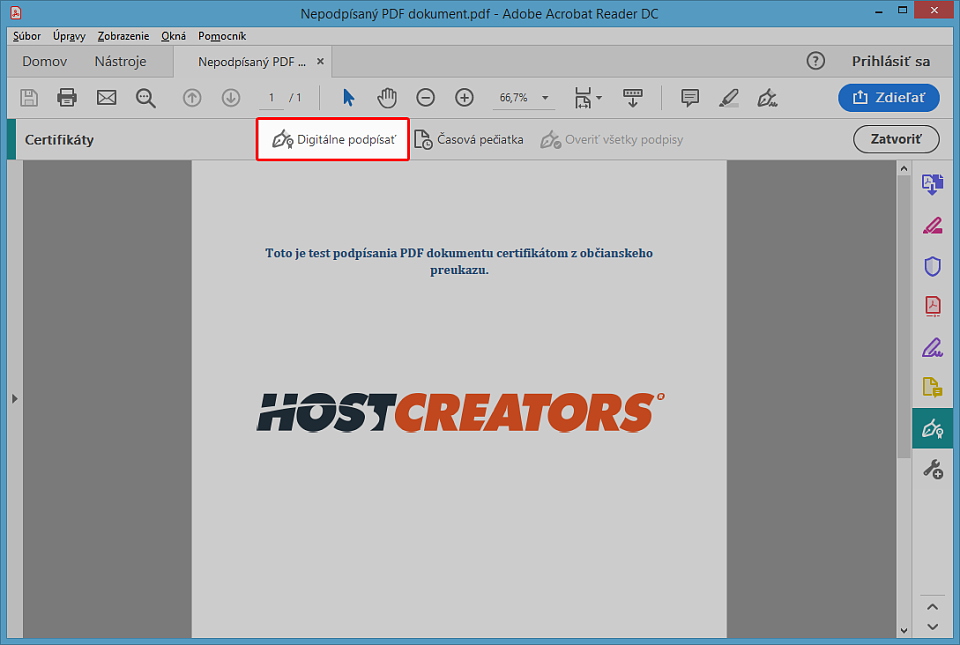 V hornej časti dokumentu sa zobrazí nový panel s názvom Certifikáty, kde sa nachádza tlačítko Digitálne podpísať: