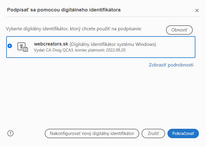 Vyberte si digitálnu identitu, ktorou budete dokument podpisovať. V našej ukážke to je naša digitálna pečať. V tomto okne by ste mali vidieť Vašu digitálnu identitu z občianskeho preukazu v prípade ak ho máte vložený do Vašej čítačky a pripojený k PC: