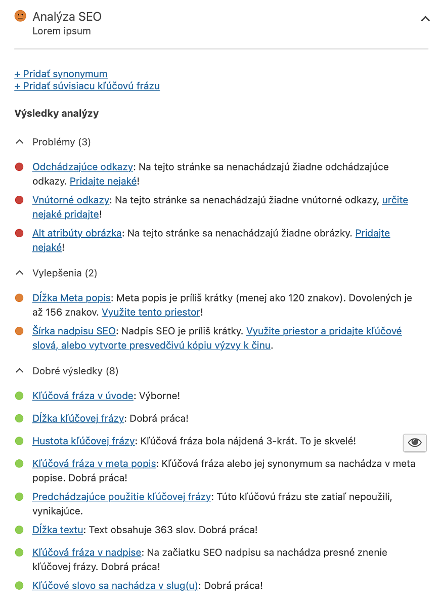 Zeleným máte naznačené dobré výsledky. Tie sú v poriadku, nemusíte s nimi robiť nič. Oranžovým sú vylepšenia. Pre lepšie SEO by ste ich mali upraviť. My máme napríklad kratší meta popis a nadpis SEO.