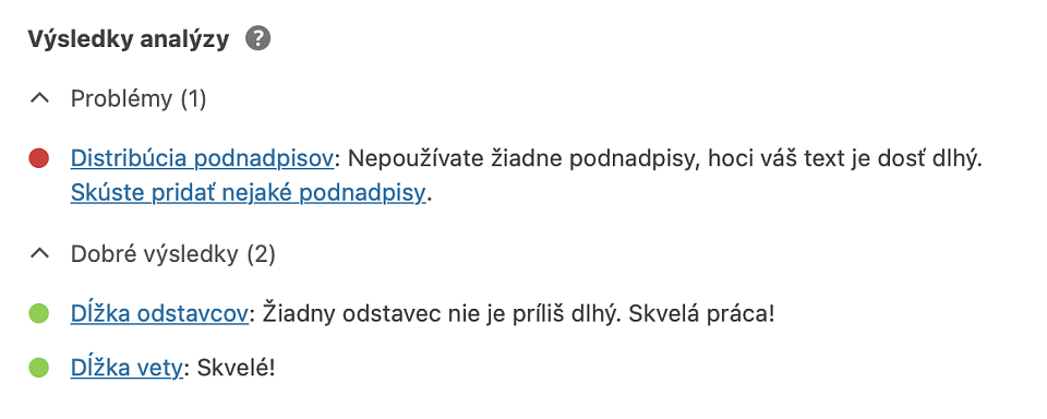 Plugin sleduje viaceré faktory a to dĺžku viet a odstavcov, a používanie podnadpisov. Nám v texte chýbajú, takže ich musíme doplniť.