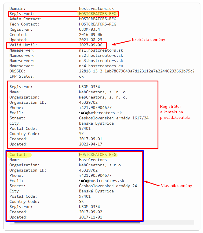 Na obrázku vidíme, že Registrant (Držiteľ, Vlastník) je kontakt so skratkou/kódom HOSTCREATORS-REG v tabuľke si podľa tohto kódu môžeme tento kontakt vyhľadať.