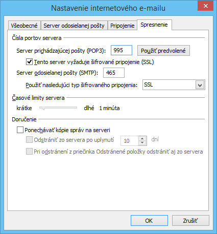 - Predchádzajúca voľba automaticky zmení port na 995 ak ide o POP3, alebo 993 ak ide o IMAP, ak to tak nespraví sám, zmeňte pôvodnú hodnotu ručne