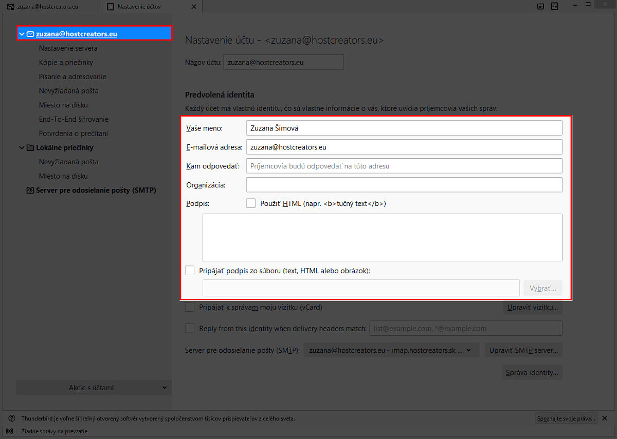 Tu môžete nastaviť meno, ktoré sa zobrazí pri Vašej e-mailovej adrese a text podpisu.