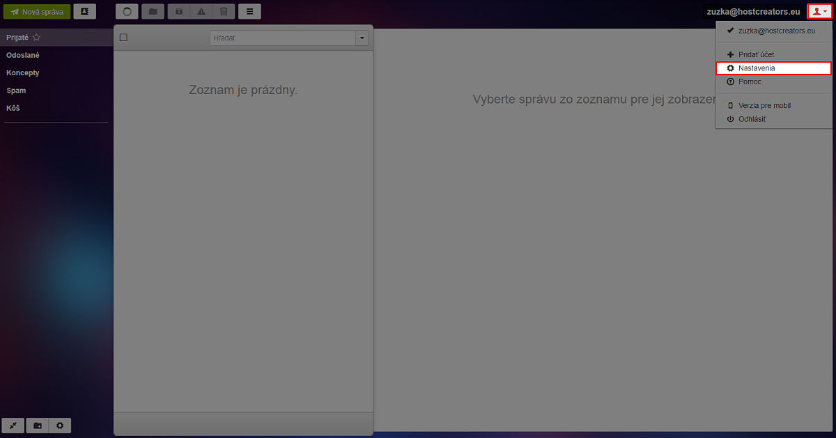 Prihláste sa do Vašej e-mailovej schránky prostredníctvom adresy webmail.vasadomena.sk, alebo cez URL adresu roundcube.hostcreators.sk.