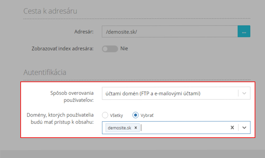Prihláste sa do webadminu, vyberte doménu a prejdite do sekcie Adresáre, kde môžete nastaviť ochranu adresárov viacerými spôsobmi.