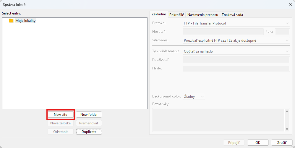 - V správcovi lokalít kliknite na tlačidlo "Nová lokalita"