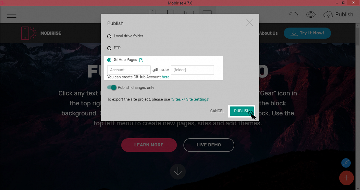 Publikujte Vaše webové stránky, kamkoľvek chcete: do zložky lokálnehodisku, na server cez FTP alebo na stránky Github.