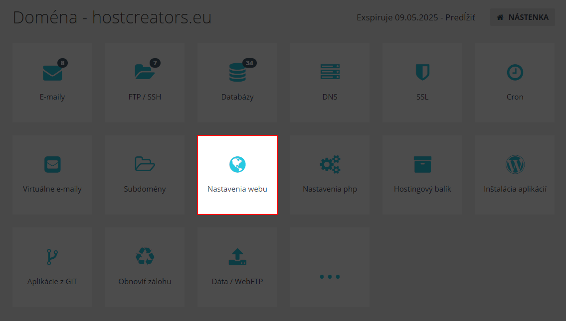 Prejdite do "Nastavenia webu". Ak budete inštalovať Prestashop na subdoméne tak prejdite do "Subdomény".