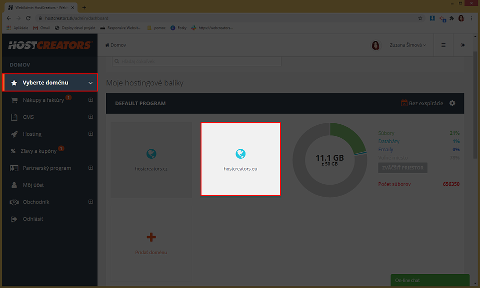Prejdite do WebAdmin-u a v ľavej časti menu, alebo na nástenke si vyberte doménu, na ktorú chcete tento redakčný systém nainštalovať.