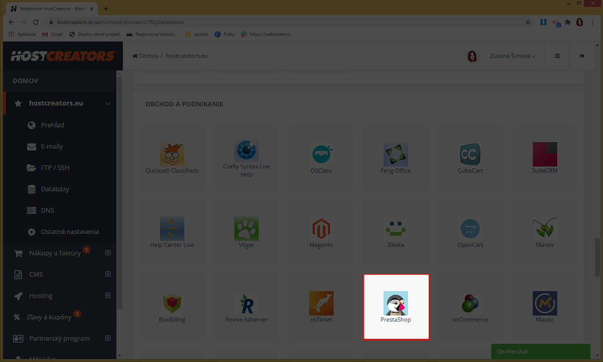 Zo zoznamu aplikácií si vyberte Prestashop. Nájdete ho v časti "Obchod a podnikanie" alebo cez formulár "Hľadaj aplikáciu".