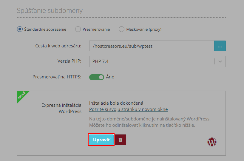 2. Alebo môžete v náhľade domény prejsť do sekcie "Nastavenia webu" a následne kliknite na tlačidlo "Upraviť" v časti "Expresná inštalácia WordPress".