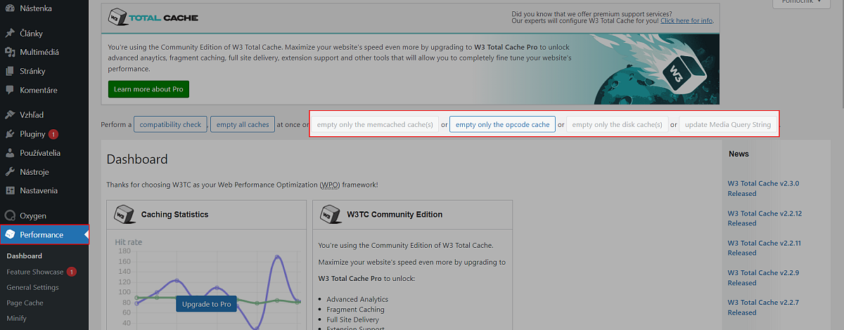 Druhá možnosť je prejsť do samotného pluginu v ľavom bočnom paneli. Kliknite na Performance -> empty all caches.
