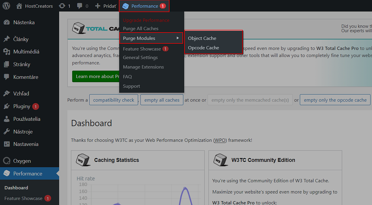 Cez horný panel nástrojov, dokážete zmazať oddelene objektovú cache a opcache po kliknutí na Performance -> Purge Modules -> Object Cache / Opcode Cachce.