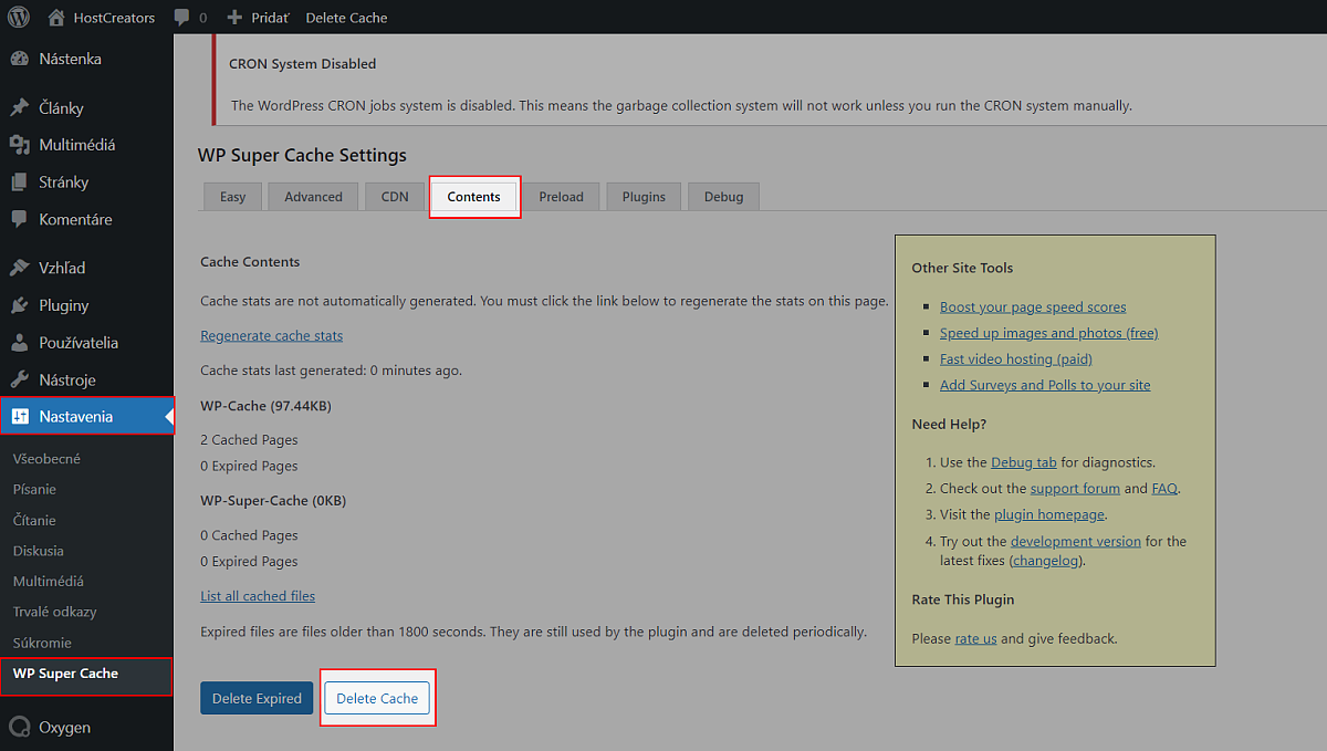 V ľavom bočnom paneli prejdite do Nastavení pluginu WP Super Cache. V hornom menu v plugine prejdite do časti Contents a kliknite na tlačidlo Delete Cache.