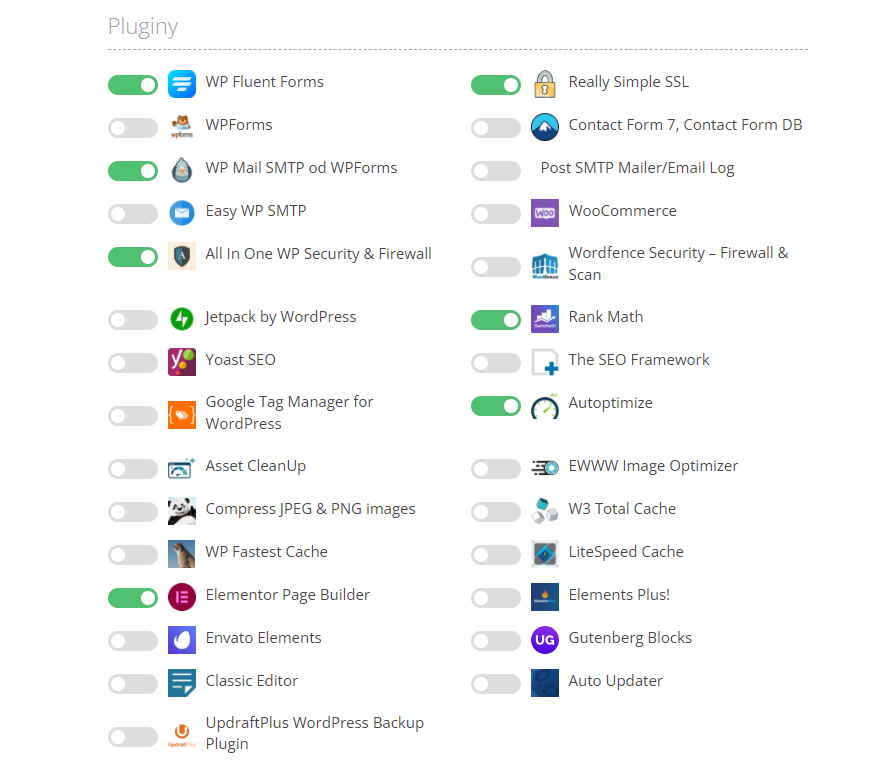 Pripravili sme pre Vás zoznam často používaných a užitočných pluginov. Niektoré z nich sme automaticky predvolili, kvôli skúsenostiam z WordPress stránok. Ide väčšinou o bezpečnostné pluginy a pluginy, ktoré optimalizujú SEO web stránky pre vyhľadávače.