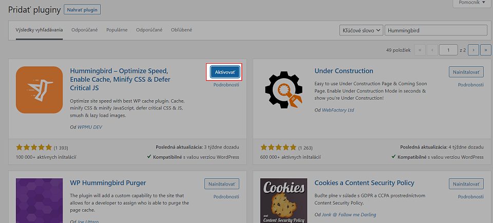 Následne nájdeme plugin tak, že do vyhľadávania napíšeme Hummingbird, a klikneme Nainštalovať.