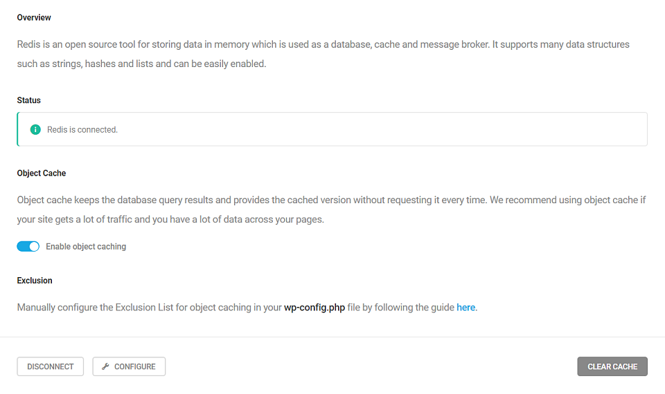 V prípade úspešného pripojenia budete vidieť vo WordPress administrácii informáciu o úšpešnom pripojení a takisto ďalšie možnosti ako zapnutie/vypnutie obejktového cachovanie, rekonfiguráciu Redis Cache, odpojenie od Redisu a zmazanie objektovej cache.