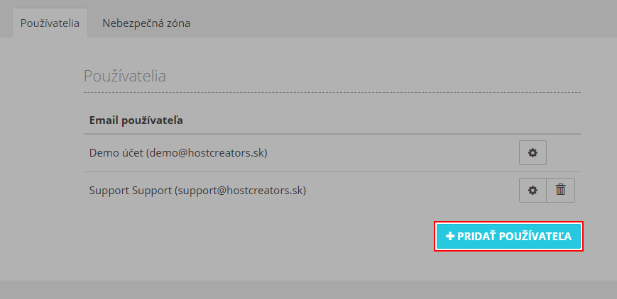 V sekcii "Ďalšie nastavenia hostingového balíčka" kliknite na tlačidlo PRIDAŤ POUŽÍVATEĽA.