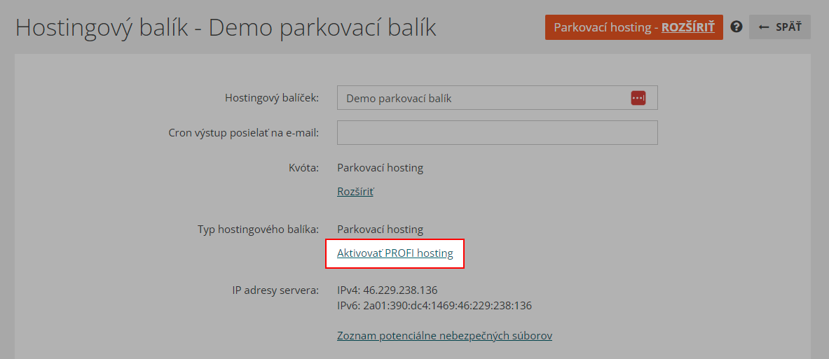 Ak by ste chceli parkovací hosting rozšíriť priamo na Profi webhosting, v hostingovom balíku kliknite na textový odkaz Aktivovať PROFI hosting.