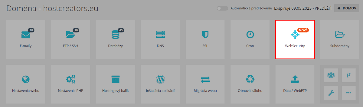 Všetky blokované požiadavky nájdete rozdelené na sekcie cez tlačidlo WebSecurity priamo z detailu domény.