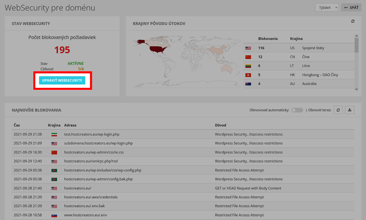 Nastavenia WebSecurity nájdete kliknutím na tlačidlo UPRAVIŤ WEBSECURITY v jeho detaile.
