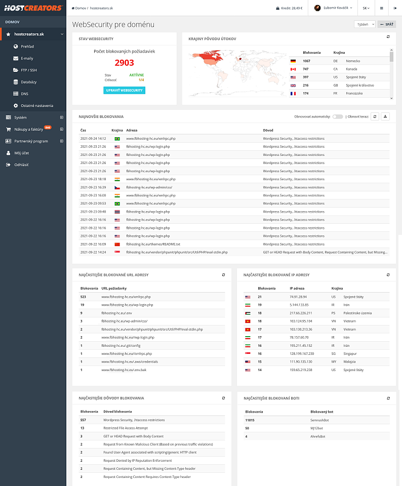 Vo WebSecurity máte možnosť nastaviť si citlivosťochranného filtra a v štatistikách si cez prehľadnú grafiku pozrieť blokované requesty.