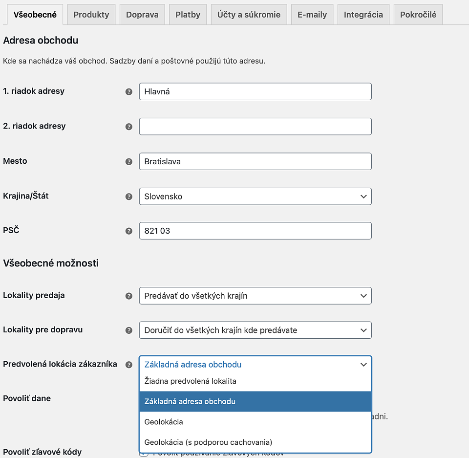 Na integráciu využíva WooCommerce geolokáciu MaxMind. Tú musíte nastaviť najprv vo všeobecných nastaveniach. V možnosti "Predvolená lokácia zákazníka" vyberte možnosť "Geolokácia".