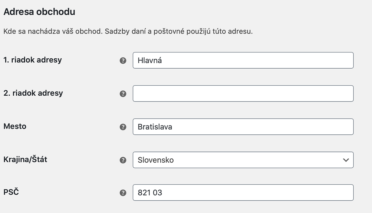Vo všeobecných nastaveniach vypĺňate základné informácie o Vašom e-shope. To znamená ulicu, mesto, štát a poštové smerovacie číslo.