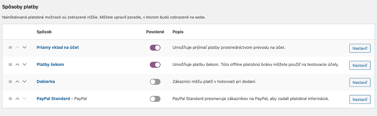 V tomto kroku vyberáte možnosti platby na Vašom e-shope. Ak chcete nejakú aktivovať, stačí kliknúť na možnosť v stĺpci “Povolené”.