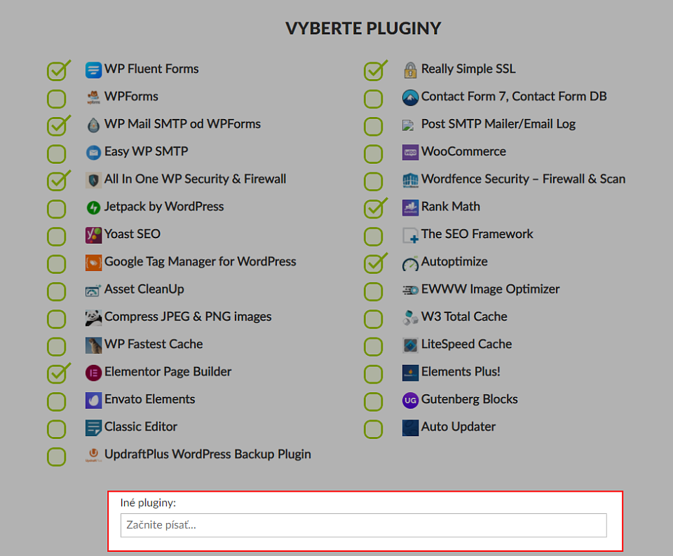 Pripravili sme pre Vás zoznam často používaných a užitočných pluginov. Niektoré z nich sme automaticky predvolili, kvôli skúsenostiam z WordPress stránok. Ide väčšinou o bezpečnostné pluginy a pluginy, ktoré optimalizujú SEO web stránky pre vyhľadávače.